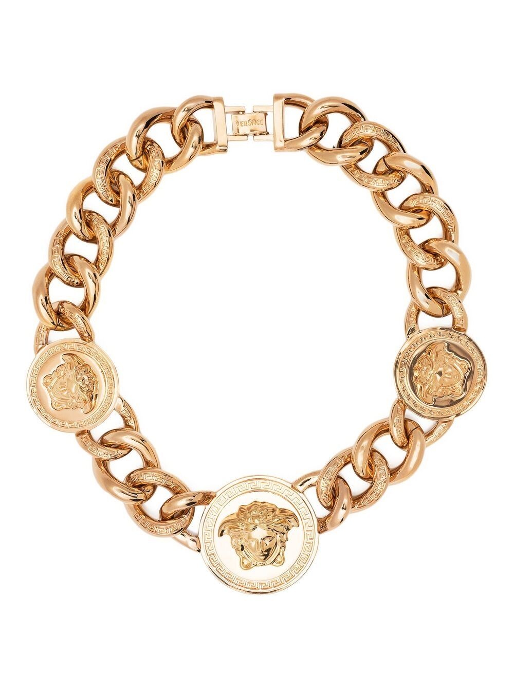 Medusa chain necklace Can't resist the allure of this Medusa chain necklace from Versace?That will be the power that the Greek mythological goddess has in enchanting you. Prepare to be seduced. Made in Italy SIZE & FIT Model measurements Height 5 ft 10 in(1.77 m) Bust/Chest 34.25 in(87 cm) Hips 38.58 in(98 cm) Waist 26.37 in(67 cm) Measurement Length when open 16.53 in(42 cm) PENDANT LENGTH 1.77 in(4.5 cm) PENDANT WIDTH 1.65 in(4.2 cm) WIDTH 0.94 in(2.4 cm)