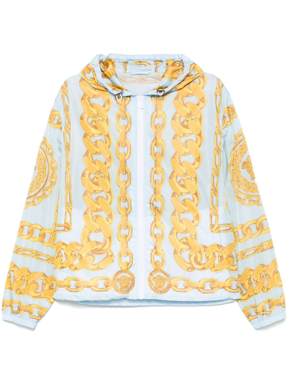 Medusa Chains-print jacket Highlights - Light blue - Front zip fastening - Drawstring hood - Two press-stud fastening side pockets - Elasticated cuffs Made in Italy Composition Lining: Polyester 100% Outer: Polyamide 100% SIZE & FIT Model measurements Height 6 ft 2 in(1.87 m) Bust/Chest 38.18 in(97 cm) Hips 36.61 in(93 cm) Waist 29.13 in(74 cm) FittingInformation Designed to be unstructured, offering a loose fit throughout The internal drawstring at the hem allows for fitted preferences Made from a lightweight non-stretch fabric