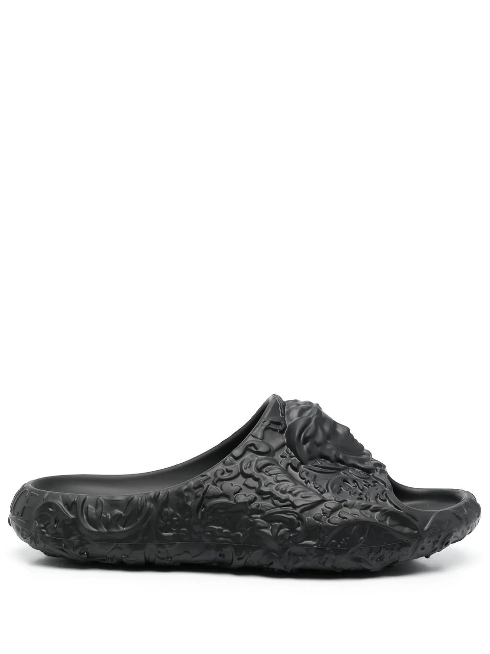 Medusa Dimensions pool slides The Medusa Dimensions slides are a symbol of Versace's bold vision, displaying the signature Medusa Head motif embossed all over the black rubber construction. Made in Italy Composition Outer: Rubber 100% Lining: Rubber 100% Sole: Rubber 100% SIZE & FIT Measurement HEEL 0.78 in(2 cm) Sole height 0.39 in(1 cm)