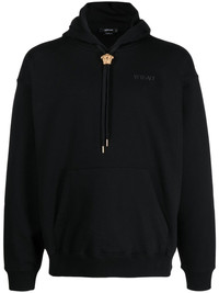 La Medusa cotton hoodie A Versace signature, the Medusa Head motif details this hoodie. In a gold-tone hue, it adds a signature opulent twist to the otherwise minimalist piece. Highlights - Medusa-drawstring rib-trimmed hoodie from versace featuring black, cotton, gold-tone hardware, medusa head motif, embroidered logo to the front, drawstring hood, drop shoulder, long sleeves, front pouch pocket and straight hem. Made in Italy Composition Cotton 100%, Viscose 100% SIZE & FIT Model measurements Height 6 ft 2 in(1.87 m) Bust/Chest 38.18 in(97 cm) Hips 36.61 in(93 cm) Waist 29.13 in(74 cm) Measurement CHEST 46.45 in(118 cm) SLEEVE LENGTH 22.83 in(58 cm) LENGTH 25.59 in(65 cm) FittingInformation Designed to be unstructured, offering a loose fit throughout Made from a midweight non-stretch fabric, this piece offers minimal elasticity when worn This piece fits true to size – take your usual size Washing instructions Machine Wash