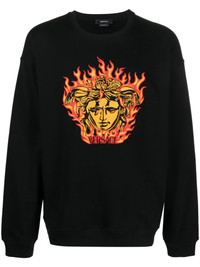 Medusa Flame-embroidered cotton sweatshirt Versace's most recognisable symbol – the Medusa Head – is seen embroidered on the front of this black cotton sweatshirt, surrounded by blazing flames. Logo lettering sits just below it. Highlights - Black - Cotton - Medusa head motif - Crew neck - Drop shoulder - Long sleeves - Straight hem Imported Composition Cotton 100%, Viscose 100% SIZE & FIT Model measurements Height 6 ft 0 in(1.84 m) Bust/Chest 36.22 in(92 cm) Hips 35.43 in(90 cm) Waist 26.77 in(68 cm) FittingInformation Designed for a relaxed fit, this piece allows for comfort and movement when worn The ribbed hem offers a close, comfortable fit Made from a midweight non-stretch fabric, this piece offers minimal elasticity when worn This piece fits true to size – take your usual size