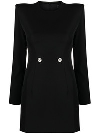 Hourglass grain-de-poudre minidress This black Versace minidress evokes a retro nostalgia for the brand’s emerging ‘80s and ‘90s era. It’s sharply tailored in grain de poudre to hold the structural strong-shouldered silhouette and minimally detailed with silver-tone Medusa Head buttons at the waist and cuffs. Highlights - Black - Virgin wool - Grain de poudre - Decorative buckle detailing - Concealed rear zip fastening - Round neck - Shoulder pads - Long sleeves - Buttoned cuffs - Straight hem Made in Italy Composition Lining: Cupro 100% Outer: Virgin Wool 100% SIZE & FIT Model measurements Height 5 ft 11 in(1.8 m) Bust/Chest 31.49 in(80 cm) Hips 35.43 in(90 cm) Waist 24.4 in(62 cm) Measurement HIPS 30.31 in(77 cm) LENGTH 30.7 in(78 cm) WAIST 27.55 in(70 cm) FittingInformation Designed for a slim fit that sits just away from the body offering a close yet comfortable fit The internal shoulder pads offer a structured shape Made from a midweight non-stretch fabric This piece fits true to size – take your usual size Washing instructions Dry Clean Only