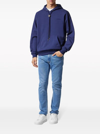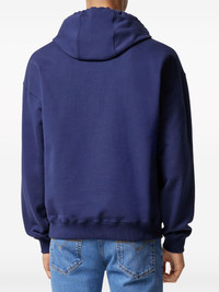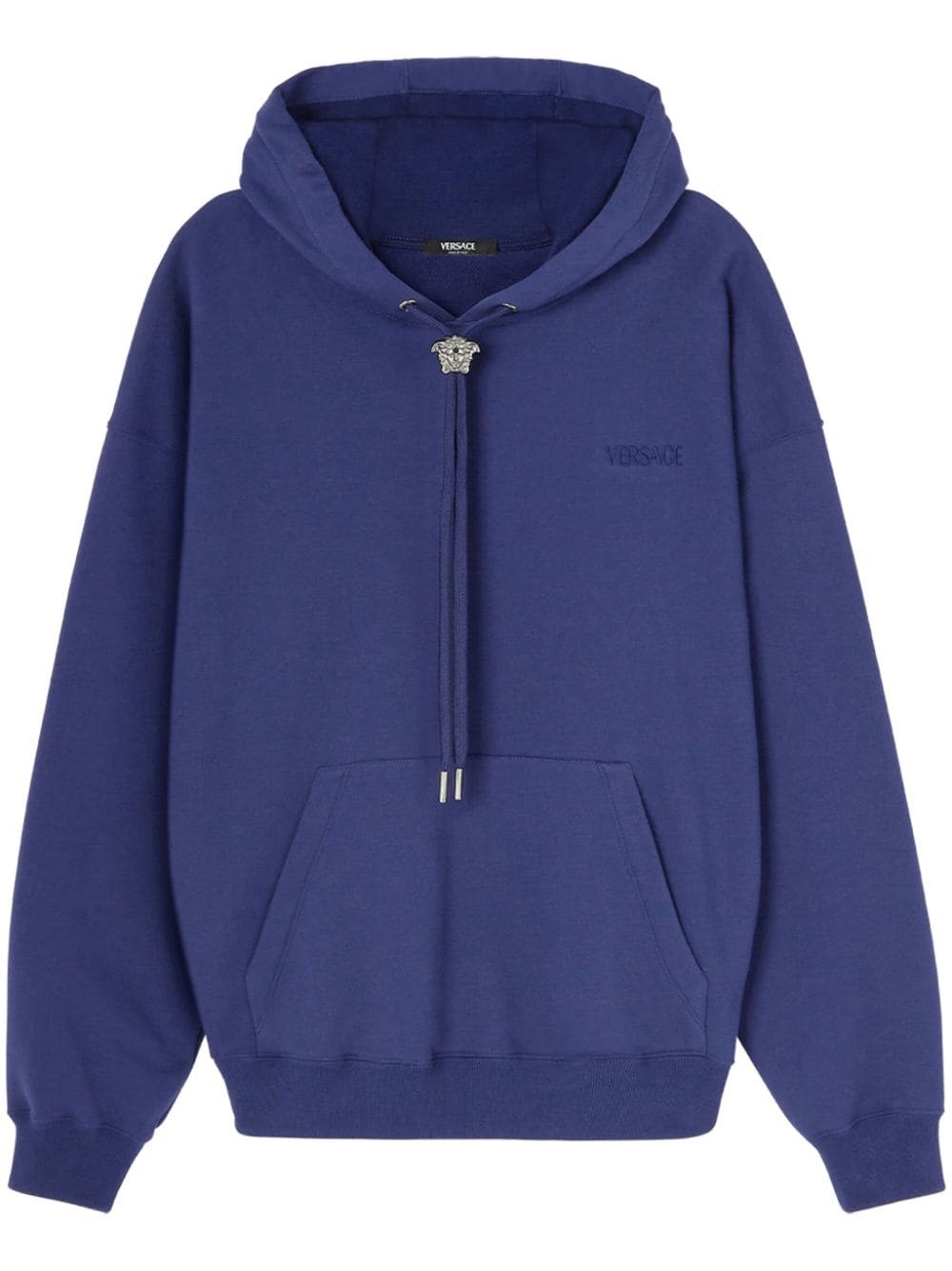 La Medusa hoodie The La Medusa toggle at the drawstrings of this black Versace hoodie acts as a functional and decorative detail – the emblem first appeared in the early ‘90s under the eponymous founder and serves as a reminder of mythological inspiration. Highlights - Blue - Cotton - Embroidered logo at the chest - Medusa head motif - Silver-tone hardware - Drop shoulder - Drawstring hood - Long sleeves - Ribbed cuffs and hem - Front pouch pocket Made in Italy Composition Lining: Cotton 100% Outer: Viscose 100%, Cotton 100% SIZE & FIT Measurement CHEST 46.45 in(118 cm) LENGTH 25.59 in(65 cm) SLEEVE LENGTH 22.83 in(58 cm) FittingInformation Designed to be unstructured, offering a loose fit throughout Made from a midweight non-stretch fabric, this piece offers minimal elasticity when worn This piece fits true to size – take your usual size Washing instructions Read Manufacturer Guidelines