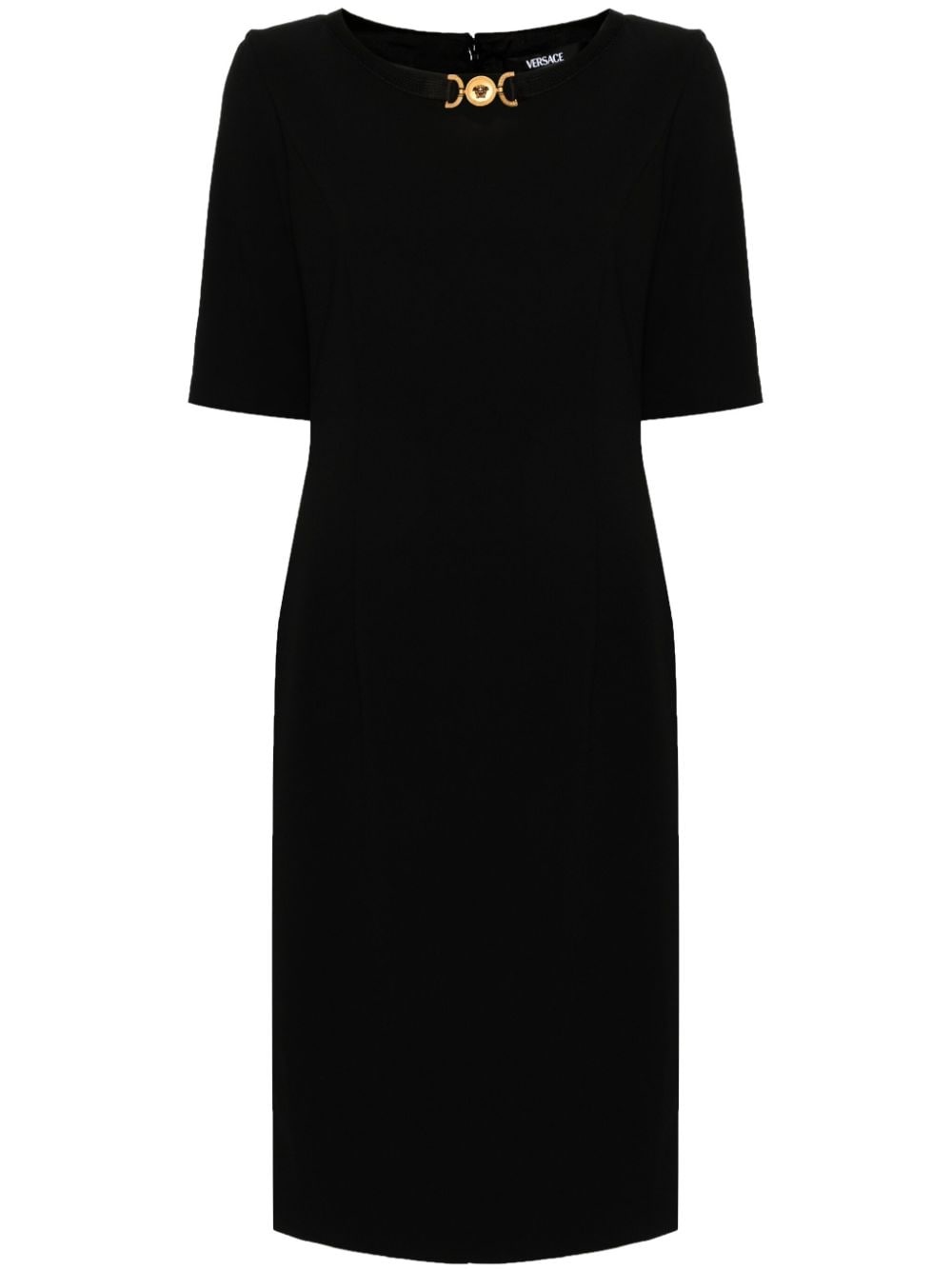 Medusa Head midi dress Highlights - Black - Crepe texture - Round neck - Medusa head motif - Short sleeves - Full lining - Straight hem - Mid-length - Concealed rear hook and zip fastening Made in Italy Composition Lining: Cupro 58%, Viscose 42% Outer: Elastane 3% SIZE & FIT Model measurements Height 5 ft 10 in(1.77 m) Bust/Chest 32.28 in(82 cm) Hips 35.03 in(89 cm) Waist 25.19 in(64 cm) FittingInformation Designed for a slim fit that sits just away from the body offering a close yet comfortable fit The dart stitching adds structure and a closer fit in the torso of this piece Made from a midweight fabric This piece fits true to size – take your usual size