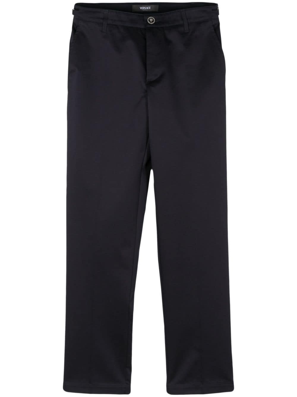 Medusa Head-motif cotton trousers Highlights - Navy blue - Cotton - Gabardine weave - Signature medusa head button - Medusa head-motif adjusters to the side - Embroidered logo to the rear - Pressed crease - Belt loops - Two side slit pockets - Two rear welt pockets - Front button and zip fastening Made in Italy Composition Cotton 100%, Viscose 80%, Polyester 20% Washing instructions Dry Clean Only