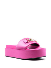 Medusa '95 platform sandals Versace imbues its branding-focused aesthetic into these platform slides, thanks to the iconic Medusa Head motif that takes central focus at the front of this slip-on pair. Highlights - Fuchsia pink - Medusa head motif - Open toe - Strap detailing - Slip-on style - Branded insole - Platform sole Imported Composition Sole: Rubber 100% Outer: Fabric 100% Lining: Fabric 100% SIZE & FIT Measurement PLATFORM 1.96 in(5 cm) HEEL 2.55 in(6.5 cm)
