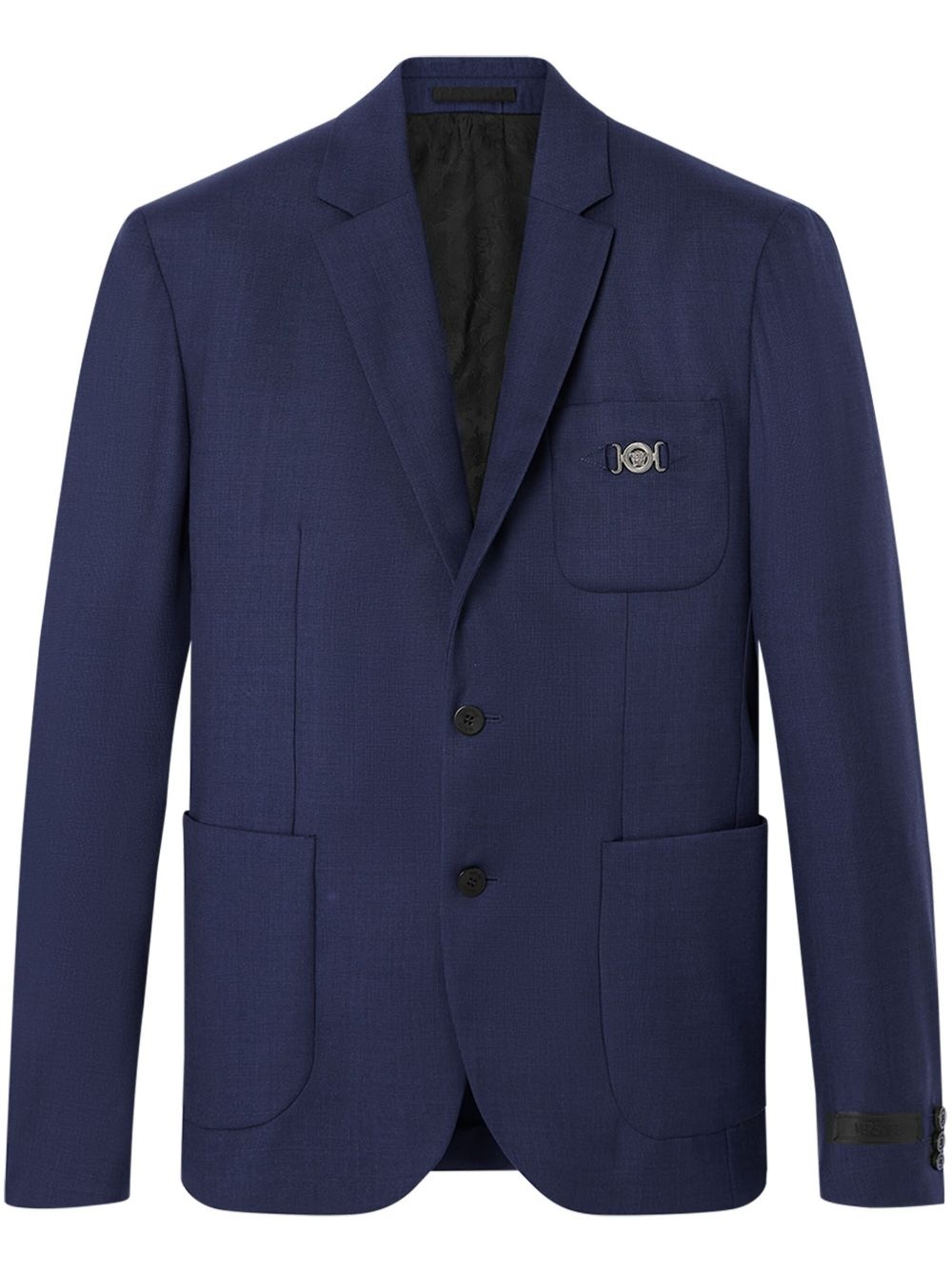single-breasted wool blazer Highlights - Navy blue - Virgin wool - Cotton lining - Medusa head motif - Applique logo - Notched lapels - Front button fastening - Long sleeves - Buttoned cuffs - Chest patch pocket - Two side patch pockets - Straight hem Made in Italy Composition Lining: Cotton 100%, Cupro 100% Outer: Virgin Wool 100%
