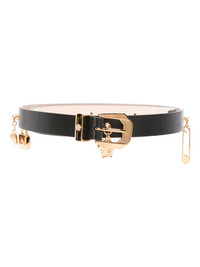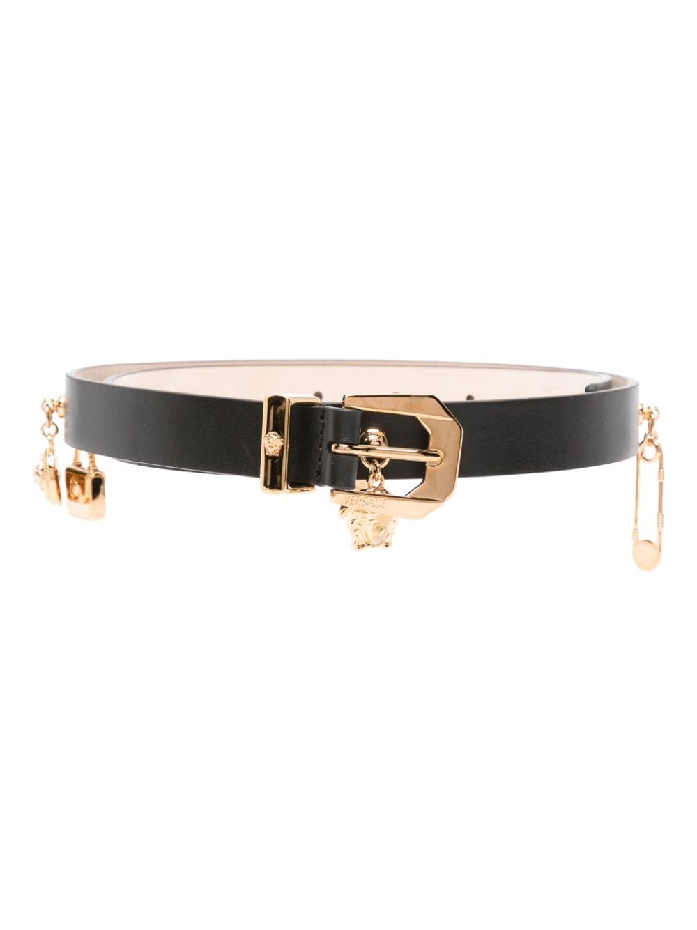 Medusa Heritage Charms leather belt Showcasing its affinity for gleaming embellishments, Versace decorates the thin leather construction of its Medusa Heritage Charms belt with golden ornaments of iconic house codes, including the Medusa Safety Pin, Aevitas platform pumps and La Medusa bag. Highlights - Black - Calf leather - Logo charm - Signature medusa safety pin detail - Gold-tone hardware - Pin-buckle fastening - Punched holes Made in Italy Composition Outer: Leather 100% SIZE & FIT Measurement Maximum Length 34.25 in(87 cm) Minimum Length 29.92 in(76 cm)