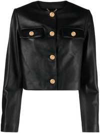 Medusa leather jacket This black leather jacket is inspired by the ‘90s collections designed by the Versace siblings. Its minimalist silhouette is punctuated with gold-tone Medusa Head buttons – a heritage emblem that debuted during the era. Highlights - Black - Calf leather - Signature medusa head buttons - Gold-tone buttons - Round neck - Front button fastening - Shoulder pads - Long sleeves - Buttoned cuffs - Two chest flap pockets - Straight hem - Barocco-jacquard lining - This piece comes with a certificate of authenticity. Made in Italy Composition Lining: Cupro 58%, Viscose 42% Outer: Calf Leather 100%, Lamb Skin 100% SIZE & FIT Model measurements Height 5 ft 11 in(1.8 m) Bust/Chest 34.25 in(87 cm) Hips 35.82 in(91 cm) Waist 24.8 in(63 cm) FittingInformation Designed for a slim fit that sits just away from the body offering a close yet comfortable fit Soft leather has a supple and smooth construction offering some flexibility This piece fits true to size – take your usual size Measurement SLEEVE LENGTH 29.92 in(76 cm) LENGTH 19.29 in(49 cm) WAIST 35.43 in(90 cm) BUST 36.22 in(92 cm) Washing instructions Specialist Cleaning