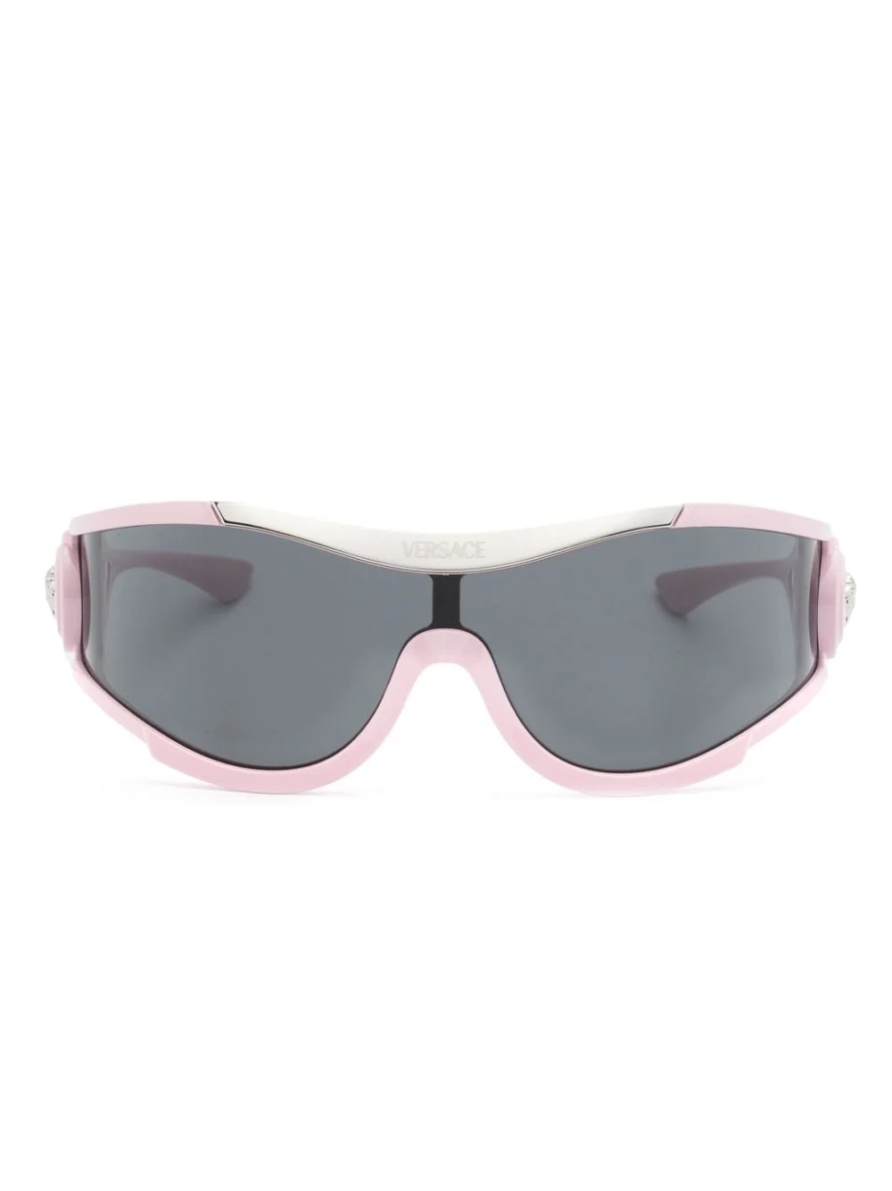 Medusa Medallion shield-frame sunglasses Highlights - Light pink - Acetate - Shield frame - Grey tinted lenses - Silver-tone logo plaque to the front - Medusa head motif to the side - Side cut-out detailing - Straight arms with curved tips - These glasses come with a protective case. Made in Italy Composition Acetate 100% SIZE & FIT Measurement Arm Length 43.3 in(110 cm) WIDTH 6.02 in(15.3 cm) Bridge Width 5.62 in(14.3 cm) Lens Diameter 2.75 in(7 cm)