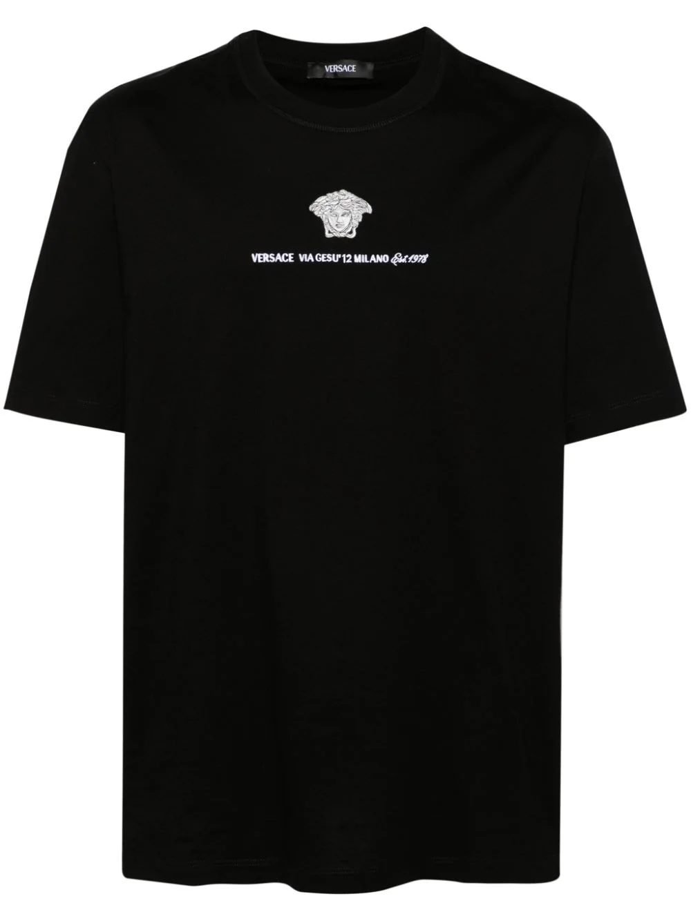 Medusa Milano embroidered T-shirt Highlights - Black - Cotton - Jersey texture - Medusa head motif - Embroidered logo to the front - Crew neck - Short sleeves - Straight hem Imported Composition Cotton 100% SIZE & FIT Model measurements Height 6 ft 2 in(1.89 m) Bust/Chest 39.76 in(101 cm) Hips 37.4 in(95 cm) Waist 29.92 in(76 cm) FittingInformation Designed for a regular fit allowing for a comfortably loose fit throughout the body Made from a midweight non-stretch fabric, this piece offers minimal elasticity when worn This piece fits true to size – take your usual size