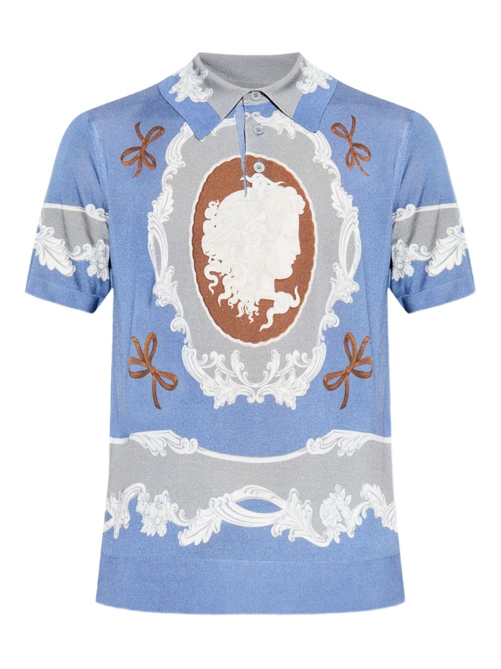 Medusa-motif polo shirt Highlights - Light blue - Baroque-inspired detailing - Ornate central motif - Decorative bows - Short sleeves - Classic collar Made in Italy Composition Silk 100%