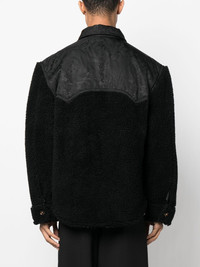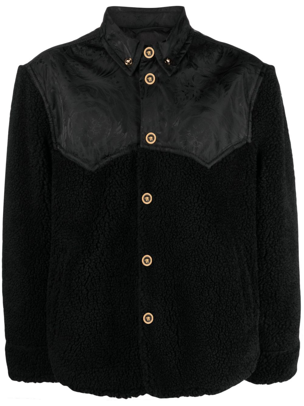 Barocco Silhouette fleece jacket Crafted from faux-shearling to a boxy shape, this black jacket from Versace is detailed with subtle house codes. Gold-tone Medusa buttons line the front, and one of the Italian label's signature prints patterns the shoulders and collar. Highlights - Black - Faux shearling - Panelled design - Classic collar - Front button fastening - Long sleeves - Buttoned cuffs Made in Italy Composition Outer: Polyamide 100%, Acetate 51%, Polyester 49% Lining: Polyamide 100% SIZE & FIT Model measurements Height 6 ft 2 in(1.87 m) Bust/Chest 38.18 in(97 cm) Hips 36.61 in(93 cm) Waist 29.13 in(74 cm) FittingInformation Designed to be unstructured, offering a loose fit throughout Made from a midweight non-stretch fabric This piece fits true to size – take your usual size Washing instructions Dry Clean Only
