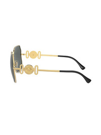 Medusa-plaque geometric-frame sunglasses Highlights - Gold-tone - Metal - Geometric frame - Green tinted lenses - Medusa plaque detail - Embossed detail - Nose pads - Sculpted arms - Curved tips - These glasses come with a protective case. Made in United States Composition Metal 100% SIZE & FIT Measurement Arm Length 5.7 in(14.5 cm) Bridge Width 0.74 in(1.9 cm) Lens Diameter 2.28 in(5.8 cm)