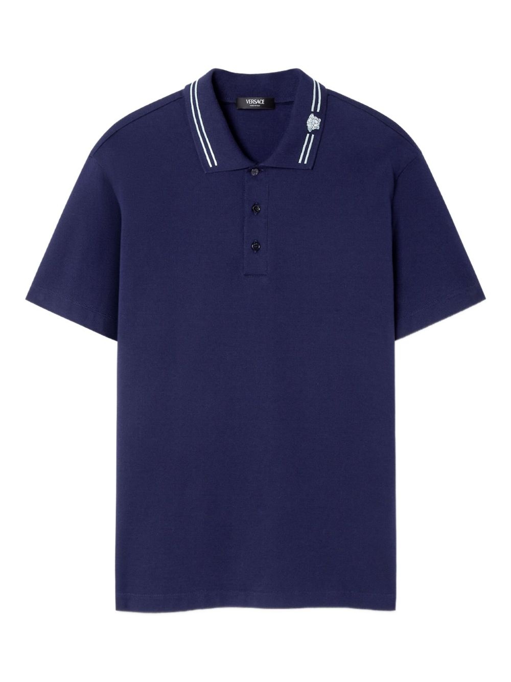 Medusa polo shirt Highlights - Navy blue - Front button placket - Stripe detailing - Polo collar - Short sleeves Made in Italy Composition Cotton 100%, Polyester 100%, Rayon 100%