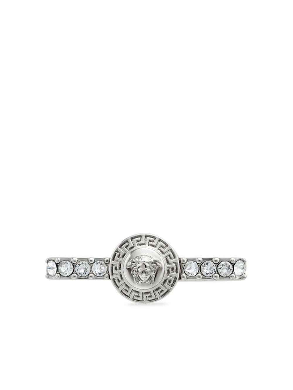 Gianni Ribbon crystal ring Highlights - Silver-tone - Metal - Polished finish - Medusa head motif - Crystal embellishment - Signature greca detailing - Engraved logo Made in Italy