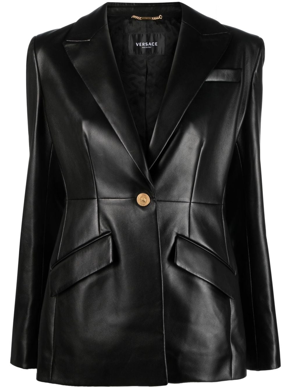 single-breasted leather blazer Versace's blazer showcases the brand's unconventional approach to Italian tailoring. Crafted from supple leather to a fitted single-breasted silhouette, it's detailed with signature Medusa Head buttons in polished gold-tone metal. Highlights - Black - Lambskin - Signature medusa head buttons - Notched lapels - Long sleeves - Buttoned cuffs - Front button fastening - Chest welt pocket - Two side flap pockets - Full lining - Central rear vent Made in Italy Composition Outer: Lamb Skin 100% Lining: Cupro 100% SIZE & FIT Model measurements Height 5 ft 10 in(1.79 m) Bust/Chest 31.49 in(80 cm) Hips 35.03 in(89 cm) Waist 23.62 in(60 cm) FittingInformation Designed for a slim fit that sits just away from the body offering a close yet comfortable fit The internal shoulder pads offer a structured shape Soft leather has a supple and smooth construction offering some flexibility This piece fits true to size – take your usual size