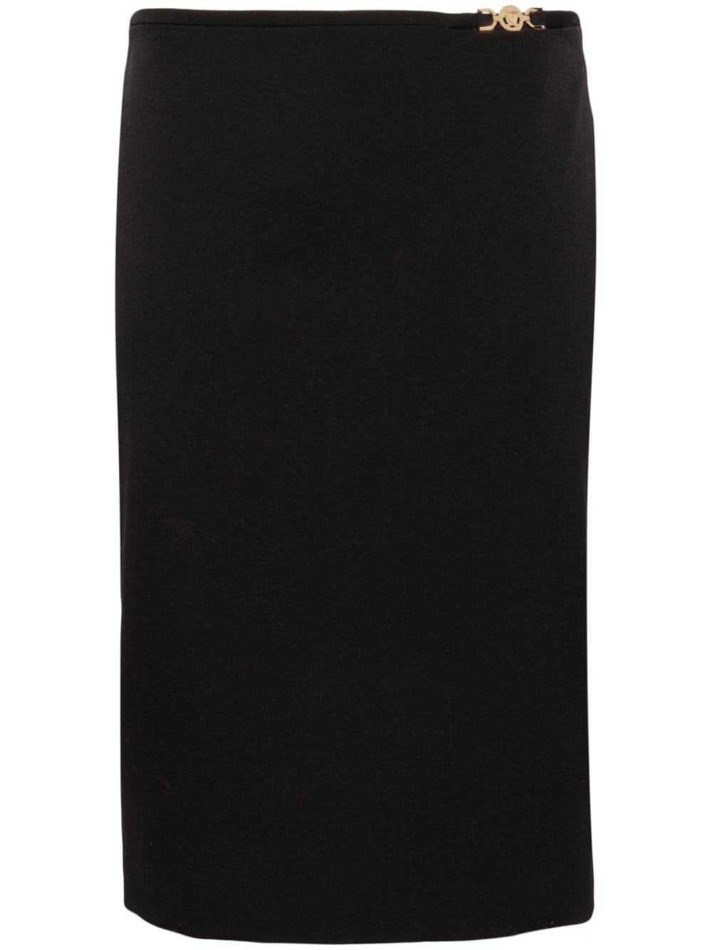 Medusa stretch-wool skirt Versace enlivens the classic black pencil skirt with its iconic gold-tone Medusa plaque: it adorns the side of the waistband. The design is cut from stretch wool. Highlights - Black - Stretch-wool - Twill weave - Dart detailing - Medusa plaque detail - Concealed rear hook and zip fastening - Full lining - Straight hem Made in Italy Composition Outer: Virgin Wool 98%, Spandex/Elastane 2% Lining: Cupro 58%, Viscose 42% SIZE & FIT Model measurements Height 5 ft 10 in(1.78 m) Bust/Chest 31.49 in(80 cm) Hips 35.03 in(89 cm) Waist 23.62 in(60 cm) FittingInformation This midi-length skirt is intended to be worn just below the waist Made from a midweight fabric This piece fits true to size – take your usual size Washing instructions Dry Clean Only