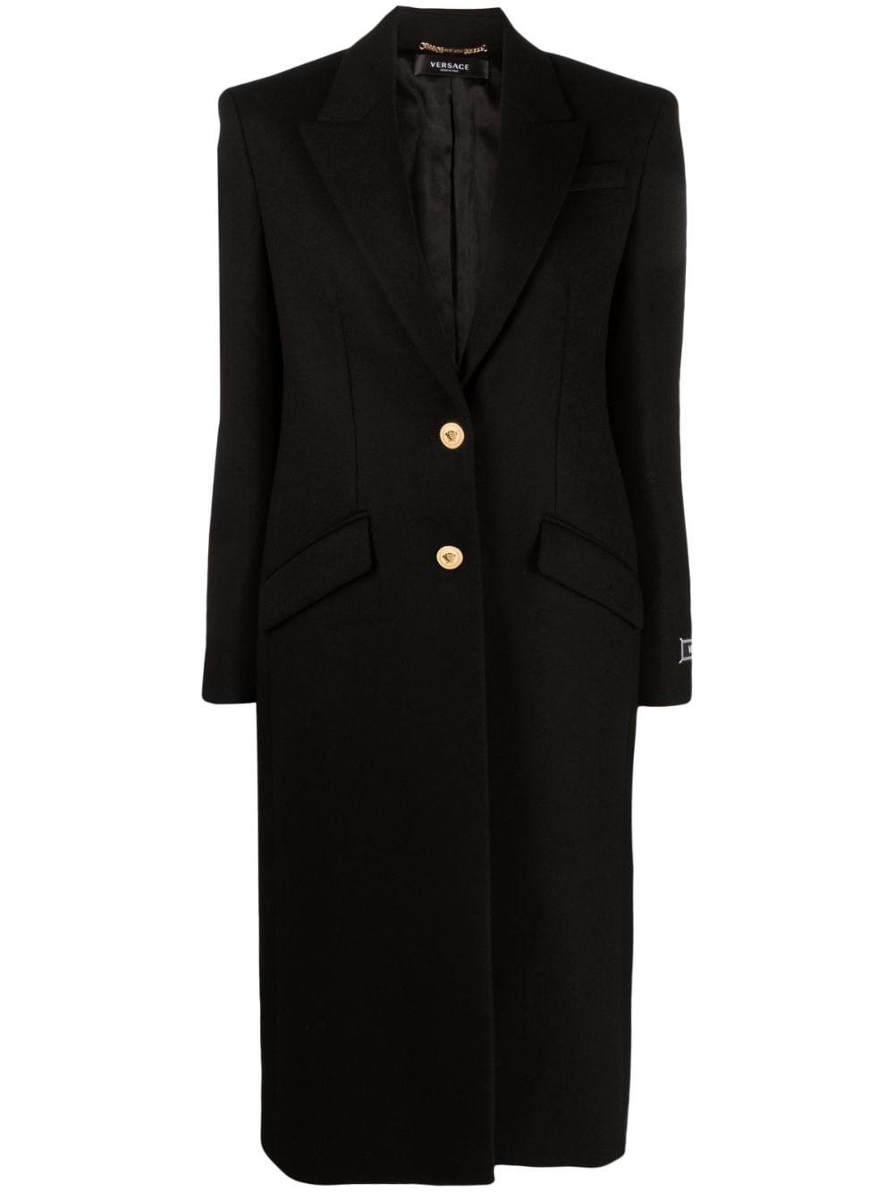 single-breasted wool-blend coat Versace showcases its subdued side with this single-breasted coat. It’s tailored from a black wool blend and topped with two gold-tone Medusa buttons. Highlights - Black - Wool blend - Gold-tone hardware - Shoulder pads - Front button fastening - Long sleeves - Buttoned cuffs - Full lining - Straight hem Made in Italy Composition Outer: Wool 85%, Polyamide 15% Lining: Cupro 48%, Viscose 41% SIZE & FIT Model measurements Height 5 ft 11 in(1.8 m) Bust/Chest 34.25 in(87 cm) Hips 35.82 in(91 cm) Waist 24.8 in(63 cm) FittingInformation Designed for a slim fit that sits just away from the body offering a close yet comfortable fit The internal shoulder pads offer a structured shape Made from a midweight non-stretch fabric This piece fits true to size – take your usual size Measurement SLEEVE LENGTH 25.59 in(65 cm) LENGTH 47.24 in(120 cm)