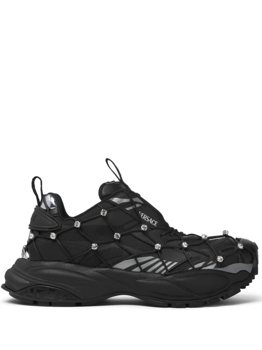 Mercury M_VS_02 sneakers Highlights - Black - Faux leather - Panelled design - Mesh panelling - Crystal embellishment - Logo print to the side - Signature greca detailing - Round toe - Front lace-up fastening - Double pull-tab at the opening - Eva midsole - Branded insole - Chunky rubber lug sole Made in Italy Composition Leather 100%