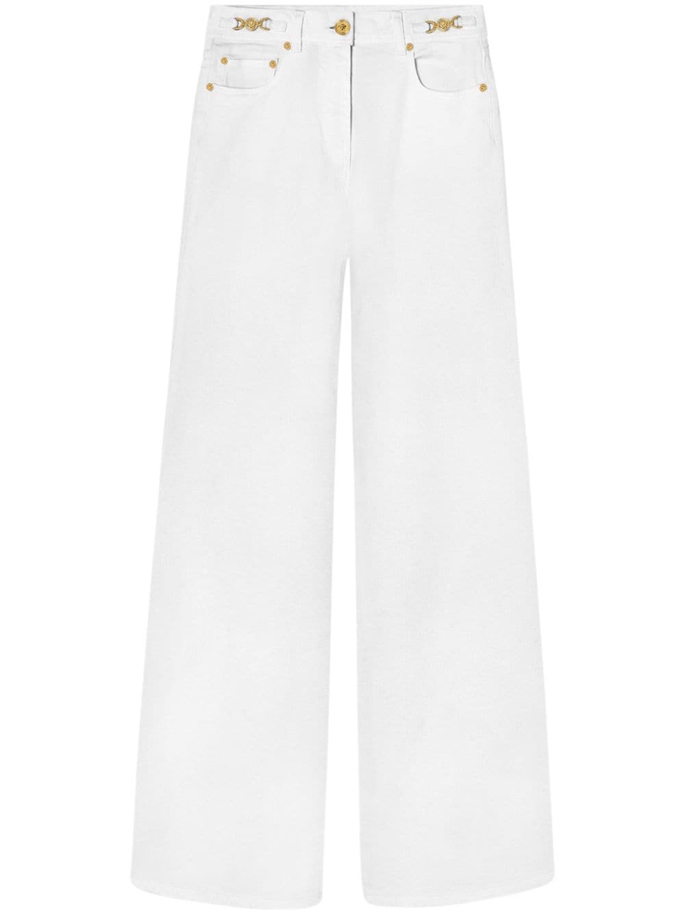 mid-rise flared jeans Highlights - White - Cotton - Denim - Medusa head motif - Logo patch to the rear - Mid-rise - Belt loops - Front button fastening - Classic five pockets - Flared Made in Italy Composition Cotton 100% SIZE & FIT Measurement FRONT RISE 10.23 in(26 cm) INSIDE LEG 35.43 in(90 cm) HIPS 36.22 in(92 cm) WAIST 26.77 in(68 cm)