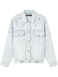 pearl-embellished denim jacket Versace offers a signature opulent touch to this denim jacket with pearl embellishments that cascade down the shoulders. The romantic adornments elevate the relaxed silhouette. Highlights - Light blue - Cotton - Denim - Faux-pearl embellishment - Straight-point collar - Front button fastening - Two chest flap pockets - Slip pockets to the sides - Long sleeves - Straight hem Imported Composition Cotton 100%