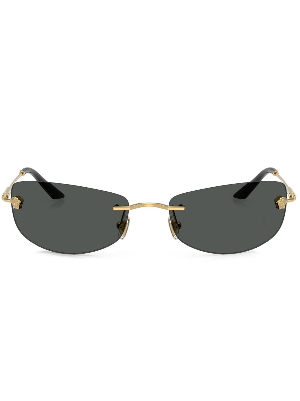 rectangle-frame sunglasses Highlights - Gold-tone - Rectangle frame - Tinted lenses - Signature medusa head rivet detailing - Straight arms - Logo plaque at the arm - Curved tips - These glasses come with a protective case. Made in United States Composition Metal 100% SIZE & FIT Measurement Arm Length 5.31 in(13.5 cm) Bridge Width 0.7 in(1.8 cm) Lens Diameter 2.36 in(6 cm)