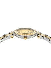 Reve 35mm Highlights - 35mm - Stainless steel - Quartz movement - Gold-tone - Baton dial - Sword hands - Signature greca detailing - Round face - Screw-down crown - Engraved bezel - Stainless steel link bracelet - Clasp fastening - Water resistance up to 50m/5 atm - This item comes with a standard one-year warranty from the brand. Imported