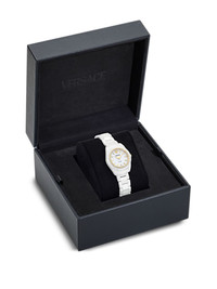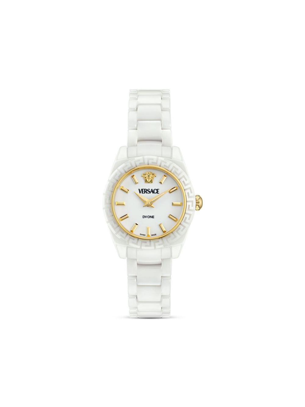 DV One Mini 28mm Highlights - 28mm - White - Ceramic - Round face - Index dial - Baton hands - Signature greca detailing - Ceramic strap - Folding clasp - Quartz movement Imported SIZE & FIT Measurement DIAMETER 1.1 in(2.8 cm)