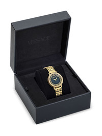 Deadalus 35mm Highlights - 35mm - Black - Stainless steel - Round face - Signature greca detailing - Baton hands - Screw-down crown - Stainless steel link bracelet - Folding clasp - Quartz movement Imported SIZE & FIT Measurement DIAMETER 1.37 in(3.5 cm)