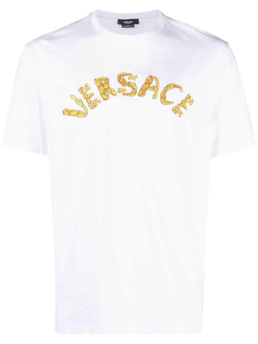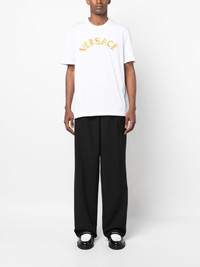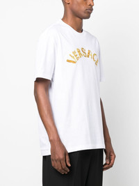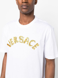 Seashell Baroque cotton T-Shirt Versace's iconic branding takes a turn in this cotton T-shirt, appearing at the chest in an embroidered construction in the shape of the Seashell Baroque logo. Highlights - White - Cotton - Embroidered seashell baroque logo to the front - Crew neck - Short sleeves - Straight hem Made in Italy Composition Cotton 100%, Viscose 95%, Polyester 5% SIZE & FIT Model measurements Height 6 ft 2 in(1.88 m) Bust/Chest 35.03 in(89 cm) Hips 35.82 in(91 cm) Waist 27.95 in(71 cm) FittingInformation Designed for a relaxed fit, this piece allows for comfort and movement when worn Made from a midweight non-stretch fabric, this piece offers minimal elasticity when worn This piece fits true to size – take your usual size