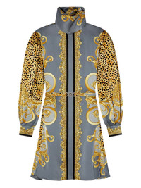 silk animal-print dress Highlights - Grey - Baroque print - Leopard print - Puff sleeves - Belted waist - High neck Imported Composition Silk 100% Washing instructions Read Manufacturer Guidelines