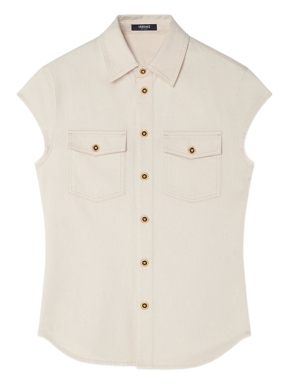 sleeveless denim shirt Highlights - Light beige - Two chest pockets - Signature medusa head buttons - Pointed collar - Sleeveless - Curved hem Imported Composition Cotton 100%