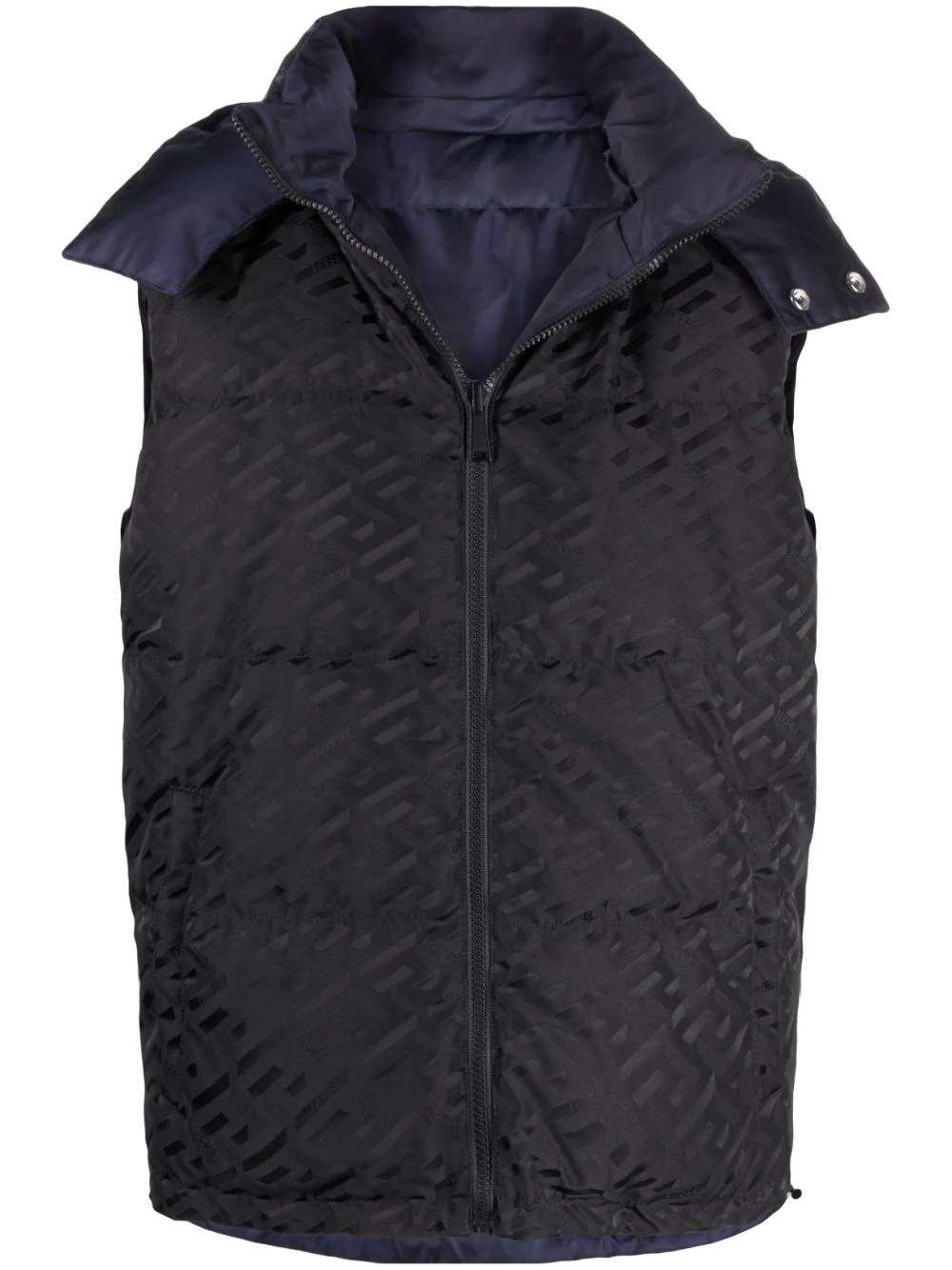 sleeveless padded gilet Versace ensures comfort with the latest collection of outerwear. This sleeveless gilet will not only keep the wearer warm but features a padded design for insulation. Imported Composition Outer: Polyamide 100% Lining: Polyamide 100%, Cotton 100%, Polyester 100% SIZE & FIT Model measurements Height 6 ft 1 in(1.85 m) Bust/Chest 38.58 in(98 cm) Hips 37 in(94 cm) Waist 30.31 in(77 cm) FittingInformation This piece fits true to size. We recommend you get your regular size Cut for a loose fit Made with a mid-weight non-stretch fabric