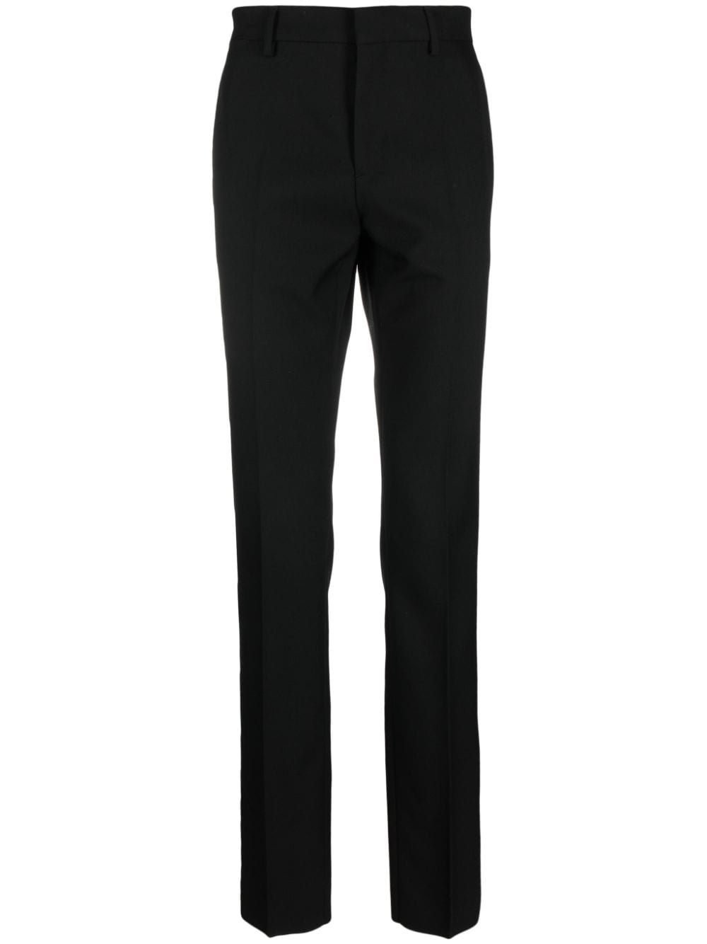 slim-cut wool trousers Versace delivers a wardrobe staple in these slim-cut trousers, made evident through their classic black tone and virgin wool construction. Highlights - Black - Virgin wool - Logo patch to the rear - Belt loops - Hook and zip fly fastening - Side pouch pockets - Two rear welt pockets - Slim cut Made in Italy Composition Outer: Virgin Wool 100% Lining: Cupro 100%, Cotton 100% SIZE & FIT Model measurements Height 6 ft 2 in(1.87 m) Bust/Chest 36.41 in(92.5 cm) Hips 35.43 in(90 cm) Waist 29.52 in(75 cm) FittingInformation Designed for a slim fit, offering a comfortable fit that sits just away from the leg Made from a midweight non-stretch fabric This piece fits true to size – take your usual size Washing instructions Dry Clean Only