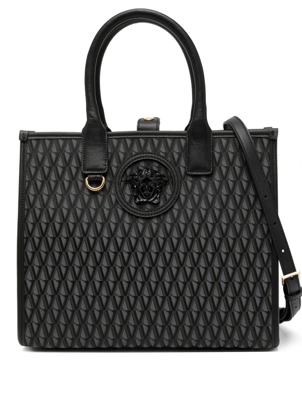 small V Allover La Medusa tote bag Highlights - Dark grey - Press-seal fastening - Two top handles - Adjustable detachable shoulder strap - Internal zip-fastening pockets Made in Italy Composition Lining: Cotton 100% Outer: Polyester 61%, Cotton 39% SIZE & FIT Model measurements Height 5 ft 10 in(1.78 m) Bust/Chest 30.31 in(77 cm) Hips 37 in(94 cm) Waist 24.8 in(63 cm) Measurement DEPTH 5.51 in(14 cm) HANDLE 5.51 in(14 cm) HEIGHT 9.44 in(24 cm) STRAP 33.85 in(86 cm) WIDTH 11.81 in(30 cm)