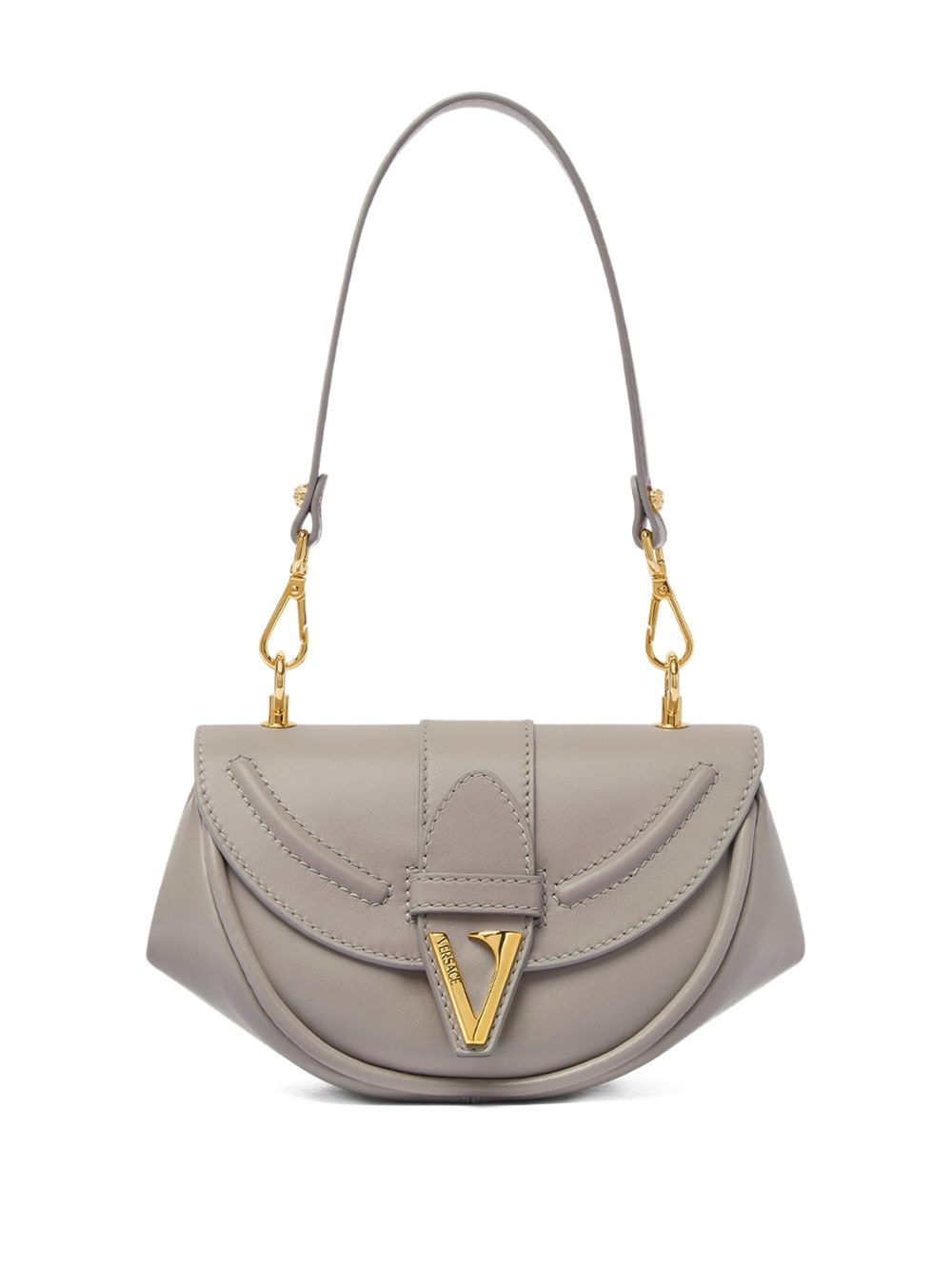 small Virtus leather shoulder bag Highlights - Grey - Calf leather - Front flap closure - Clasp fastening - Detachable shoulder strap Made in Italy Composition Outer: Calf Leather 100% Lining: Cotton 100% SIZE & FIT Measurement DEPTH 4.92 in(12.5 cm) HEIGHT 5.9 in(15 cm) WIDTH 10.43 in(26.5 cm)