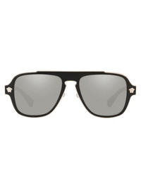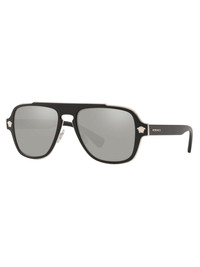 square frame sunglasses Black metal square frame sunglasses from VERSACE Eyewear featuring mirrored lenses, a logo at the temple and straight arms with angled tips. This item comes with a protective case. Made in Italy