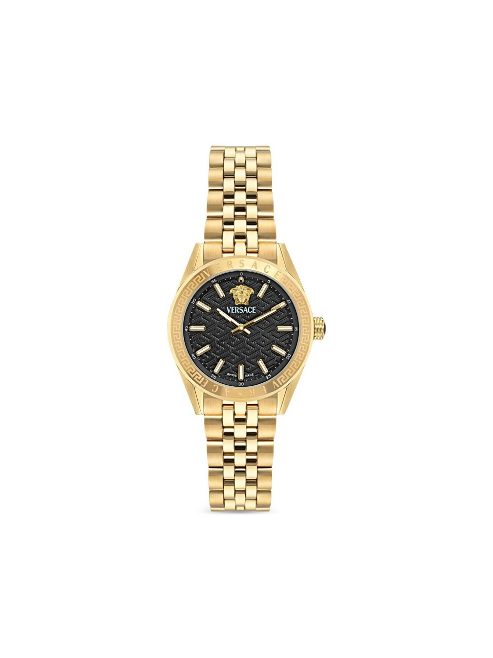 stainless steel 36mm Highlights - Gold-tone - Round case - 36mm - Black dial - Quartz movement - Gold-tone crown - Engraved logo - Normal everyday use and external agents may reduce the lustre of gemstones and gold surfaces. to maintain, use specific, non-abrasive products specially meant for cleaning jewellery. - Original box included. - This item comes with a standard one-year warranty from the boutique. Imported SIZE & FIT Measurement DIAMETER 1.41 in(3.6 cm)
