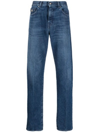 straight-leg mid-rise jeans Versace showcases its denim prowess with these jeans. Crafted from cotton to a straight leg silhouette, they arrive in a mid-wash blue and play host to a signature Medusa Head plaque on the right hip. Highlights - Blue - Cotton - Mid wash - Concealed fly and button fastening - Medusa plaque detail - Belt loops - Classic five pockets - Straight leg Made in Italy Composition Outer: Cotton 100% Lining: Polyester 65%, Cotton 35% SIZE & FIT Model measurements Height 6 ft 1 in(1.86 m) Bust/Chest 37.4 in(95 cm) Hips 34.64 in(88 cm) Waist 29.13 in(74 cm) FittingInformation Designed for a tapered leg, these jeans allow a loose unrestricted fit over the leg with a closer fit towards the ankle Sturdy and hard-wearing, this denim piece offers no stretch This piece fits large – take one size down Washing instructions Machine Wash