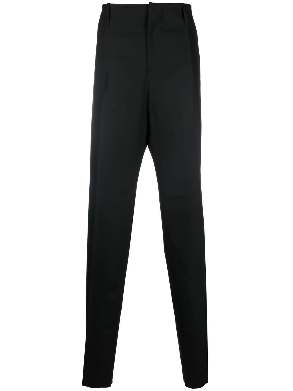 straight-leg twill trousers black cotton twill weave concealed fly and button fastening belt loops mid-rise two diagonal pockets to the sides two rear welt pockets straight leg Made in Italy Composition Lining: Cotton 100%, Cupro 100% Outer: Virgin Wool 98%, Spandex/Elastane 2% SIZE & FIT Model measurements Height 6 ft 2 in(1.88 m) Bust/Chest 36.61 in(93 cm) Hips 35.82 in(91 cm) Waist 27.95 in(71 cm) FittingInformation This piece fits true to size. We recommend you get your regular size Designed for a slim fit at the waist and loose over the leg Made with a mid-weight non-stretch fabric Washing instructions Dry Clean Only
