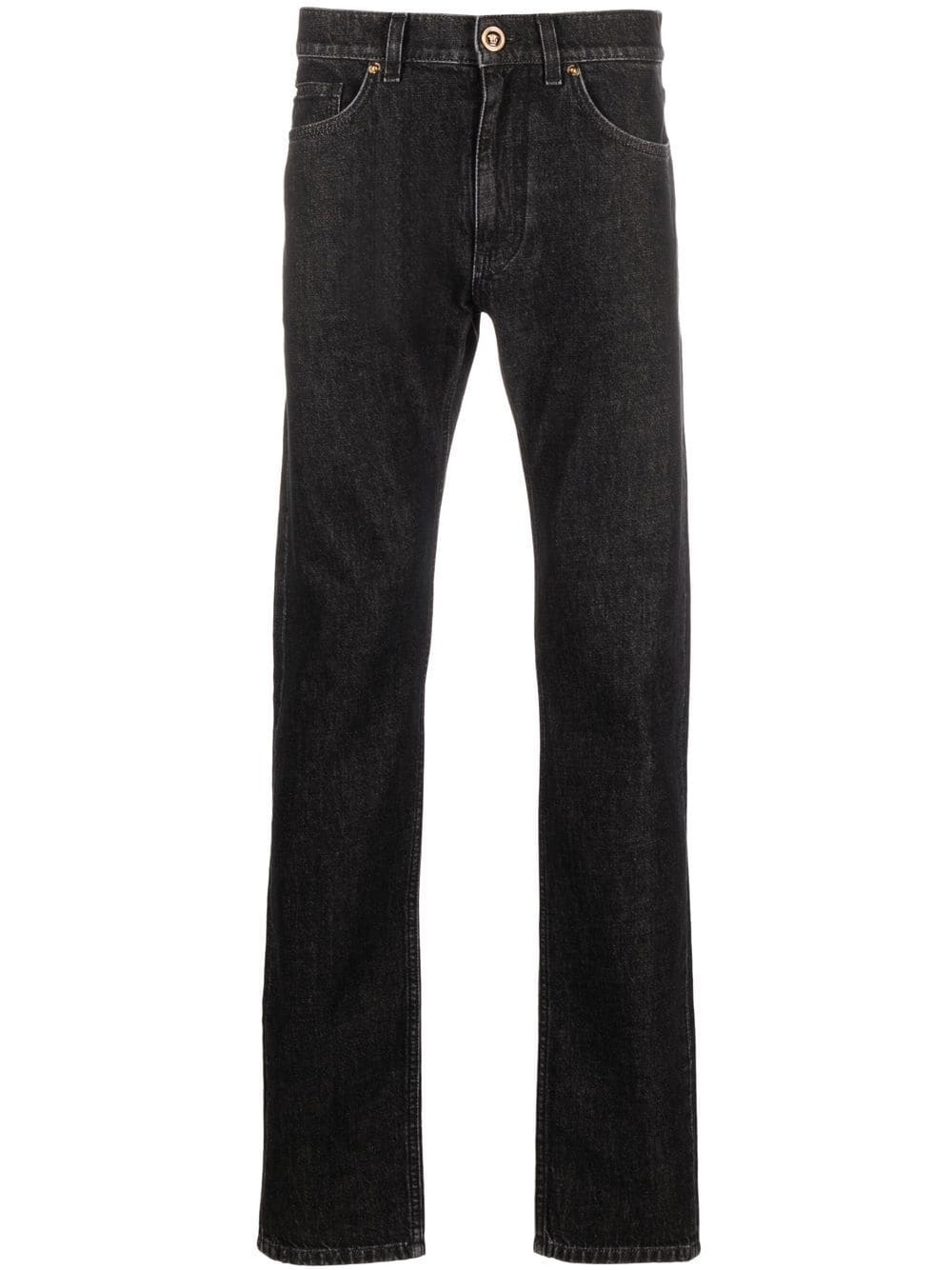 tapered denim jeans Cut in a tapered leg, Versace adds signature style codes to these denim jeans with its iconic Medusa head motif that appears to the back pocket. Made in Italy Composition Outer: Cotton 100%, Polyester 100%, Calf Leather 100% Lining: Polyester 65%, Cotton 35% SIZE & FIT Model measurements Height 6 ft 3 in(1.9 m) Bust/Chest 35.03 in(89 cm) Hips 36.22 in(92 cm) Waist 28.74 in(73 cm) FittingInformation This piece fits true to size. We recommend you get your regular size Cut for a slim fit Made with a mid-weight non-stretch fabric Washing instructions Machine Wash