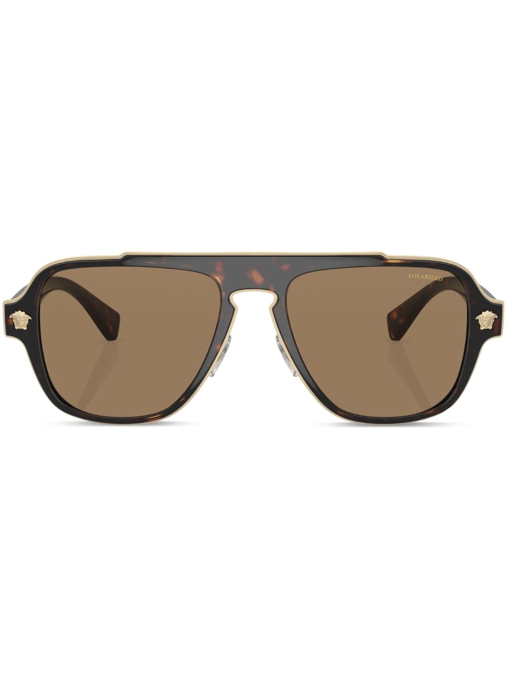 tortoiseshell-effect pilot-frame sunglasses cedar brown metal/acetate tortoiseshell effect Medusa plaque detail brown tinted lenses pilot frame straight arms curved tips These glasses come with a protective case. Made in Italy Composition Metal 100%, Acetate 100% SIZE & FIT Measurement Lens Diameter 2.2 in(5.6 cm) Bridge Width 0.7 in(1.8 cm) Arm Length 5.7 in(14.5 cm)