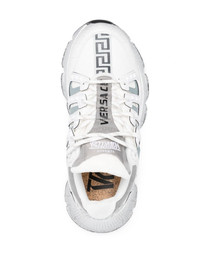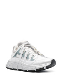 Trigreca low-top sneakers The innovative Trigreca trainers from Versace add to the Italian houses dynamic look. This white and silver-tone version features their "Greca Cushioning System" and three-dimensional Greca detailing on the soles which provides extra cushioning whilst on the move. Highlights - White/silver-tone - Calf leather - Logo print to the side - Panelled design - Round toe - Front lace-up fastening - Branded heel counter - Chunky rubber sole Made in Italy Composition Leather 100% SIZE & FIT Measurement HEEL 1.77 in(4.5 cm) Sole height 0.78 in(2 cm)
