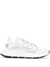 Trigreca low-top sneakers Saturday sneakers have arrived. Forgot the loafers, brogues and Derbies of the week gone by, Versace is here to help you get out there and enjoy yourself. Lace yourself in to luxury. Highlights - White - Leather/fabric - Greca-detail at the toe - Almond toe - Front lace-up fastening - Flat rubber sole Made in Italy Composition Calf Leather 100% Outer: Calf Leather 100%, Viscose 100% Sole: Rubber 100% Lining: Cork 100%, Fabric 100% SIZE & FIT FittingInformation This piece fits true to size. We recommend you get your regular size