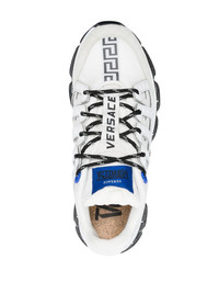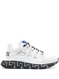 Trigreca low-top sneakers white/black/blue calf leather signature Greca-pattern print panelled design logo patch at the tongue round toe front lace-up fastening branded insole chunky rubber sole Made in Italy Composition Lining: Calf Leather 100%, Fabric 100% Outer: Calf Leather 100%, Fabric 100% Sole: Rubber 100% SIZE & FIT Measurement HEEL 1.77 in(4.5 cm) Sole height 0.98 in(2.5 cm)
