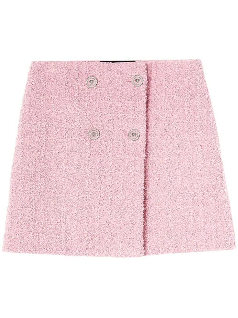 tweed high-waist skirt Highlights - Light pink - Virgin wool-mohair blend - Tweed - Signature medusa head buttons - Front button fastening - High-waisted - Straight hem Made in Italy Composition Outer: Virgin Wool 77%, Mohair 14%, Nylon 9% Lining: Cupro 58%, Viscose 42% SIZE & FIT Measurement LENGTH 15.98 in(40.6 cm) WAIST 27.99 in(71.1 cm) HIPS 34.01 in(86.4 cm) Washing instructions Read Manufacturer Guidelines