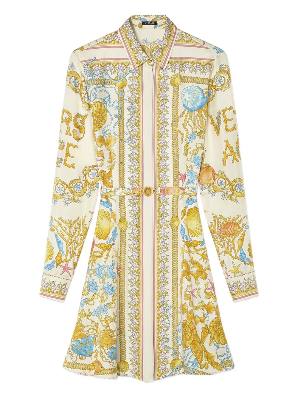 Underwater Barocco silk midi shirt dress Highlights - Gold-tone - Concealed front button fastening - Underwater barocco print - Belted waist - Long sleeves - Medusa plaque detail Made in Italy Composition Silk 100%
