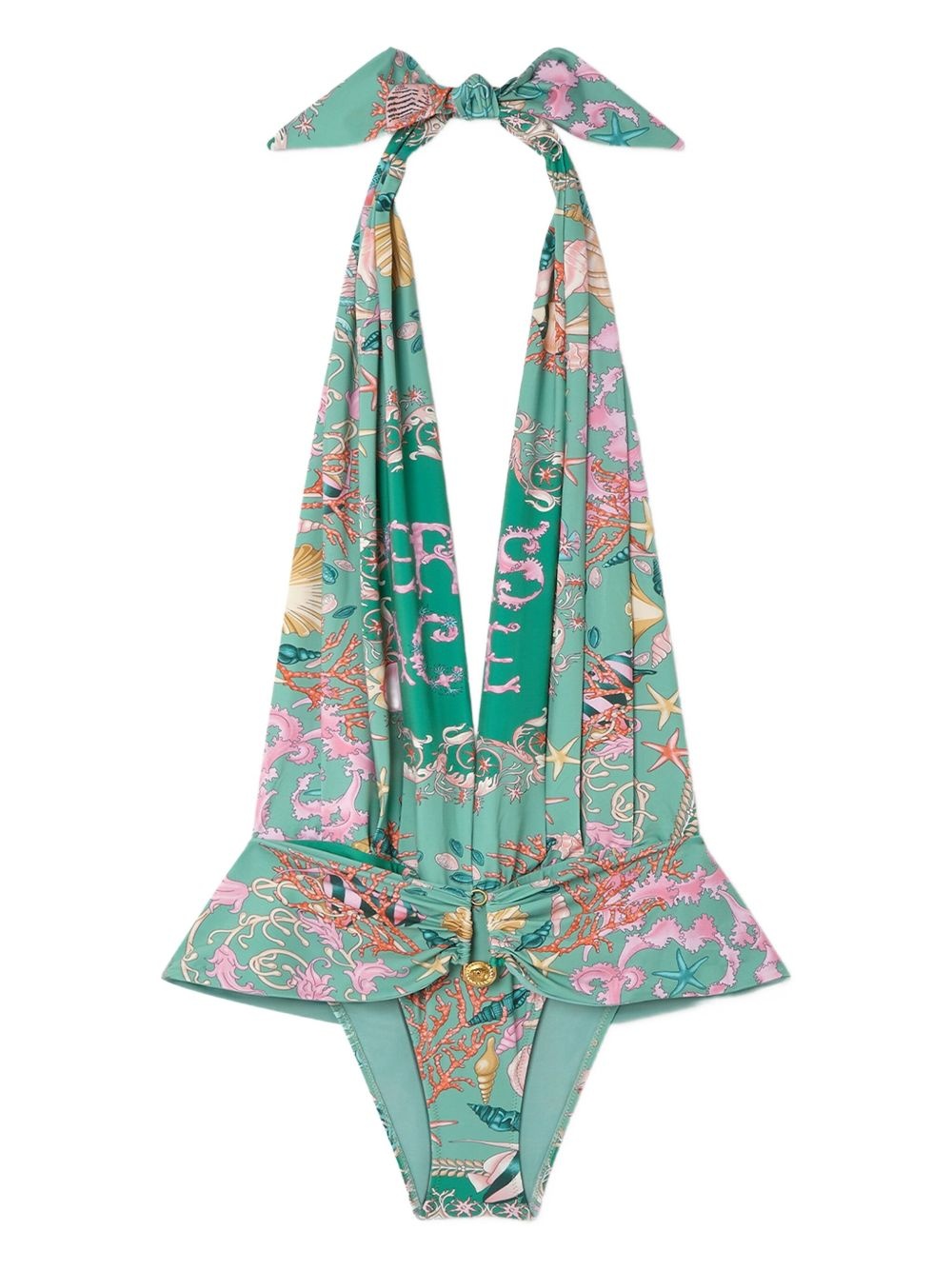 Underwater Barocco swimsuit Highlights - Sea green - Halterneck tie fastening - Signature barocco print - Signature medusa safety pin detail - Plunging v-neck - Open back - Be mindful to try on swimwear over your own garments. Imported Composition Outer: Polyamide 90%, Spandex/Elastane 10% Lining: Polyester 88%, Spandex/Elastane 12%