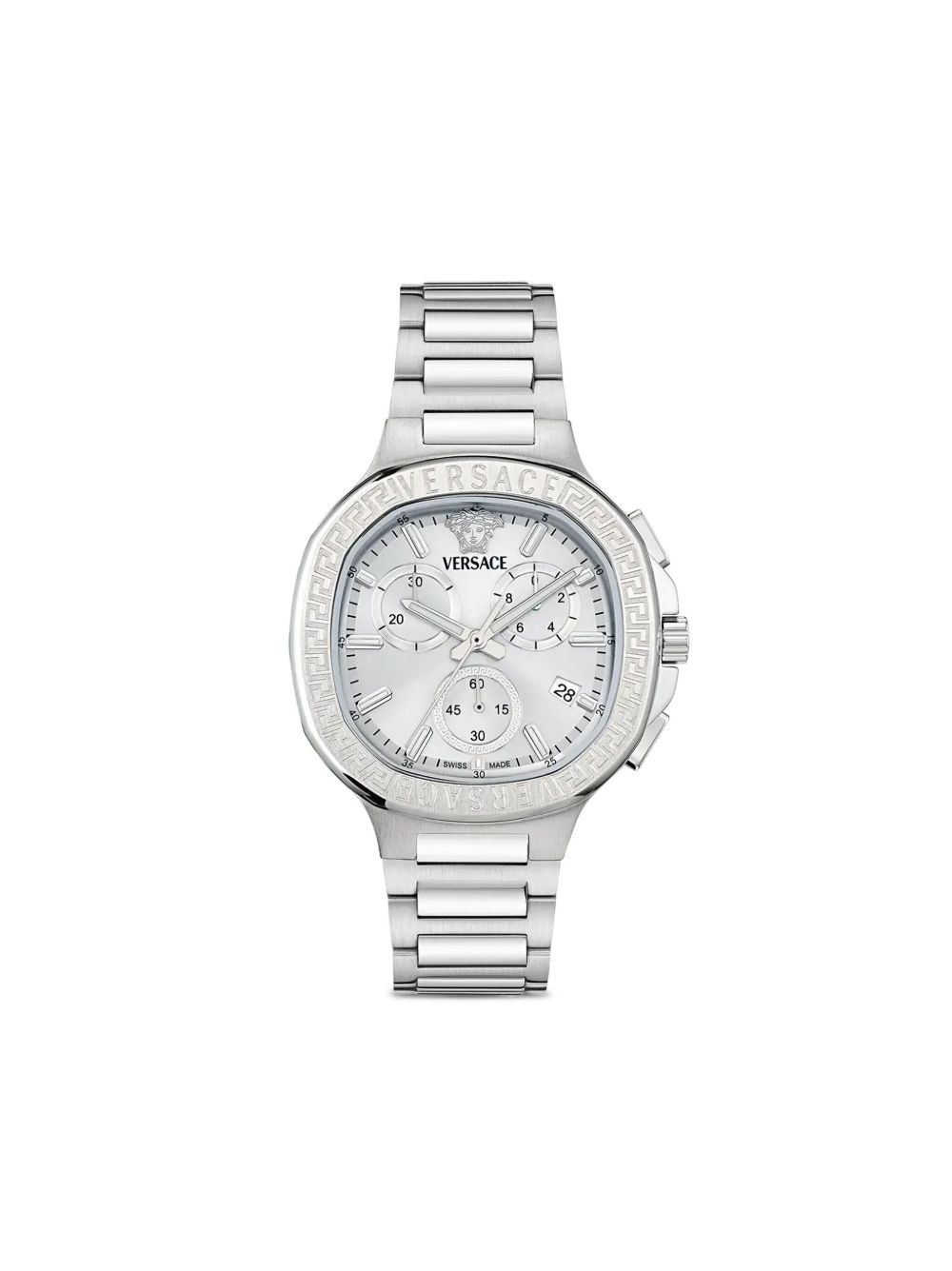 V-Chrono 40mm Highlights - 40mm - Stainless steel - Silver-tone - Quartz movement - Cushion face - Geometric dial - Baton hands - Chronograph counters - Screw-down crown - Signature greca detailing - Medusa head motif - Chain bracelet - Clasp fastening - This item comes with a standard one-year warranty from the boutique. Imported SIZE & FIT Measurement DIAMETER 1.57 in(4 cm)